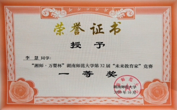 (通讯员 肖伍蓉)2020年10月28日,生命科学学院2020级学科教学(生物)研究生李慧荣获“湘师·万婴杯”湖南师范大学第32届“未来教育家”竞赛一等奖。此次比赛总共有335人参加,分为研究生组、本科文科组和理科组,经过“教育教学小论文测试”、“教育学科基础知识与硬笔、软笔书法测试”、“研学活动”、“微课教学”四轮激烈角逐,研究生组参赛者中最终有5名研究生晋级即兴演讲和公开答辩决赛环节,我院李慧同学在决赛中表现优异,荣获一等奖。