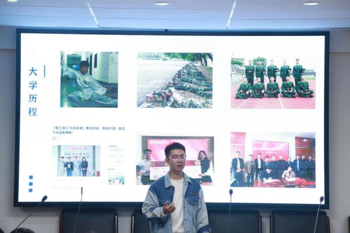 胡含兵以图示及口述的方式,结合自身经历向同学们分享大学生活经验,并通过互动的形式引导同学们了解大学生活。他向同学们介绍挑战杯、创青春和互联网+等比赛,鼓励同学们积极参加创新创业活动。他也提出多与人交流沟通,多利用学校提供的平台学习知识,开拓自己的认知等建议。