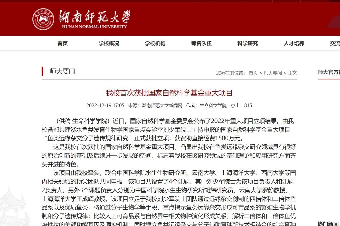 这是湖师大首次获批的国家自然科学基金重大项目,凸显出我校在鱼类远缘杂交研究领域具有很好的原始创新的基础及后续进一步发展的空间,标志着湖师大在该研究领域的基础理论和应用研究方面齐头并进的特色。