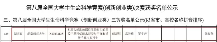 陈海燕老师指导2021级生物科学本科生高天雅和罗宇奔完成的“机器人辅助的原位生物打印的明胶甲基丙烯酸水凝胶与干细胞诱导毛囊皮肤再生”项目,荣获第八届全国大学生生命科学竞赛(创新创业类)三等奖;指导高天雅、周博昊以及22级本科生李琼湘、董徐睿勋、王瑜秋、龙文念完成的“肤康新科——人工智能化的皮肤原位打印体系”项目,荣获2023年“红枫计划”暨“麓山杯”创新创业大赛二等奖,是我校在本次赛事中获得的最高奖项。