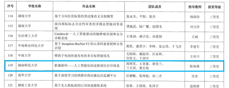 陈海燕老师指导的研究生团队在第四届湖南省研究生人工智能创新大赛中荣获三等奖。团队核心成员包括周博昊(2022级生物技术与工程硕士研究生)、王青豪(2022级生物技术与工程硕士研究生)、廖美兰(2023级生物技术与工程硕士研究生)、兰天琪(2023级生物技术与工程硕士研究生)、曹心萌(2023级生物化学与分子生物学硕士研究生)。同时,该团队还斩获了长沙市第二十届“岳麓山杯”大学生创新创业大赛三等奖,为我校在本次赛事中获得的唯一奖项。赛后,项目负责人周博昊接受了“湖南经视”电视台记者采访。项目核心成员包括周博昊(2022级生物技术与工程硕士研究生)、马潇潇(2021级生物与医药硕士研究生)、杨长城(生物化学与分子生物学博士研究生)。