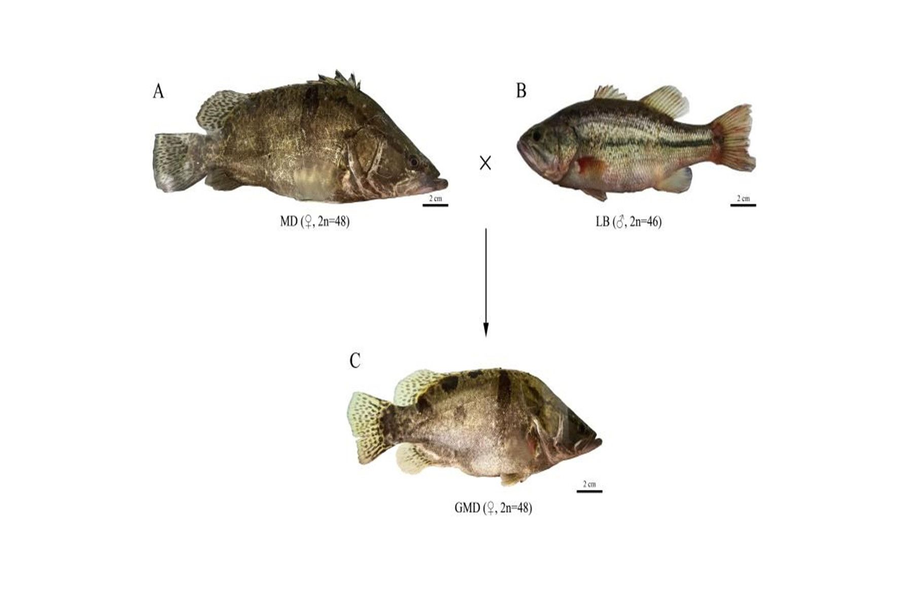 刘少军院士科研团队在系统的研究及应用鱼类雌核发育育种技术基础上,选用大口黑鲈(Micropterus salmoides, 2n=46)精液(精子),诱导雌性翘嘴鳜进行雌核发育,成功获得了具有异精效应的存活雌核发育翘嘴鳜(图1);对雌核发育翘嘴鳜的个体、细胞和分子生物学特征等进行了系统研究,发现雌核发育翘嘴鳜的外形特征、DNA含量、染色体数目(2n=48)与核型(6sm+12st+30t),5S r DNA标记(203和281 bp两个片段)、线粒体DNA序列等特点与普通翘嘴鳜相似;使用性别特异性引物对雌核发育翘嘴鳜进行了性别鉴定,证实所得雌核发育翘嘴鳜为全雌性;然而,值得注意的是,微卫星DNA图谱显示雌核发育翘嘴鳜基因组中有来自父本大口黑鲈的DNA片段插入,这是异精效应的重要证据之一。