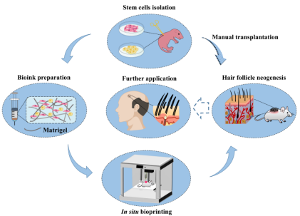 大面积烧伤和全层皮肤创面修复是临床治疗的世界性难题,迫切需要人工皮肤替代物。毛囊等皮肤附属器官的缺失以及人工皮肤治疗的复杂操作程序限制了人工皮肤替代品的进一步临床应用和发展。针对以上问题,该研究团队首先构建了基于3D打印机的皮肤原位打印体系,实现了毛囊再生的机械工程化;继而开发了一种含3D扫描仪、视觉识别系统和六自由度生物打印机械臂的皮肤机器人。该皮肤机器人能够快速识别、重建和定位皮肤伤口,并进行原位生物打印修复。通过原位生物打印进行修复的皮肤伤口可以实现全层皮肤的再生,包括表皮、真皮、血管、毛囊和皮脂腺,非常接近于健康的皮肤。同时,通过对可应用于临床的皮肤再生材料进行深入探索,发现Fibrin水凝胶可应用于含毛囊的皮肤再生修复,且生物相容性很好。这些研究使皮肤再生修复向机械工程化迈进,为皮肤修复和再生提供了一种新的方法,具有重要的临床意义。此外,在一些特殊环境下,如X射线、治疗新冠感染等传染性疾病的病人时应用该体系可以很好地保护医护人员,未来更有望应用于战伤修复等领域。