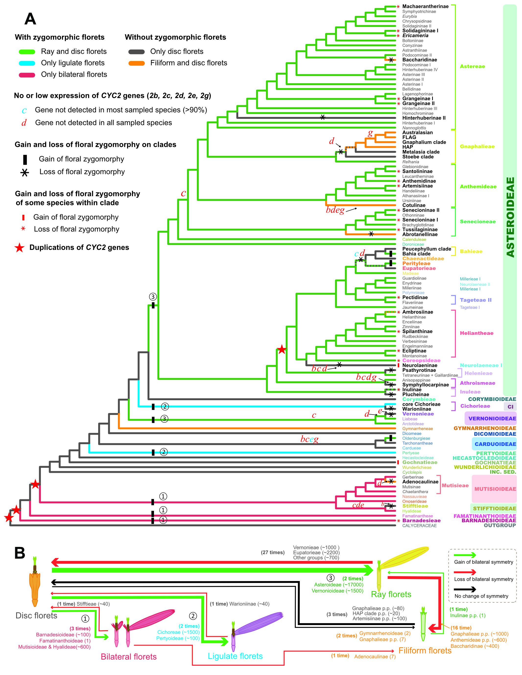 图1 (A)基于转录组和超低覆盖度浅层测序基因组数据获取的1094个核基因重建的菊科核基因系统发育树,展示花对称性在菊科的平行演化模式和CYC2基因的低表达或不表达与花两侧对称性丢失的联系。(B)通过祖先性状重建获得的菊科不同类型小花之间的演化模式。