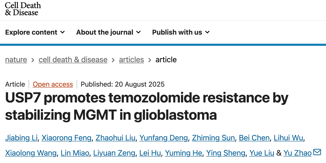 近日,湖南师范大学动物多肽药物创制国家地方联合工程实验室赵宇教授团队在自然(Nature)出版集团旗下的权威学术期刊、中科院JCR一区Top期刊《细胞死亡与疾病》(Cell Death & Disease, IF: 9.6)上发表了最新研究成果。该研究针对脑胶质瘤(GBM)的化疗抵抗难题取得重要突破,精准阐明了去泛素化酶USP7调控DNA损伤修复关键蛋白MGMT稳定性的分子机制,为逆转脑胶质瘤的化疗抵抗提供了新的策略和理论依据。