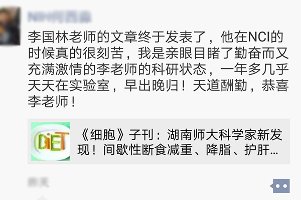 本怀一腔热血,却屡受打击。从2015年3月正式研究开始,李老师将全部身心都投入了这个伟大而艰辛的事业,但意外的是,将近8个月都几乎没有取得阳性结果,反而经历了无数次阴性结果的打击。在放弃的边缘,他找到Gonzalez博士倾诉,Gonzalez博士安慰他,"Negative is also science."不经历失败,很难接近成功。二者经常相辅相成地出现,不能因挫败而固步自封、停滞不前。合作者的鼓励、自身对科学真理的追求以及对造福人类健康的坚持,使他重新走上了研究之路。终于,在同年12月份,近10个月的实验终于有了希望的曙光——他得到了一个阳性结果。李老师的兴奋之情溢于言表,立刻将其他的全部项目停下,并申请了延期回国。得益于美国国立卫生研究院的资金支持,他设计了更多的实验,研究、筛查断食减肥的表型和机制。
