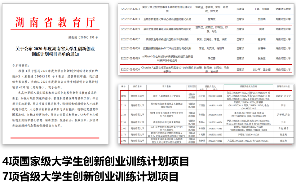 4. 构建生物科学卓越拔尖人才培养体系。创新能力融入人才培养全过程建立创新能力训练、实践教学与科研合作、毕业设计与科研融、课外科技活动自主创新多种模式。大学生提前进研究室,鼓励参加创新实验项目、创新创业大赛、挑战杯竞赛等。优化生物科学卓越教师课程,强化教育实践。2020年建成湖南省基础学科拔尖学生培养基地——“爽秋学堂”生物科学基础学科拔尖学生培养基地,2021年首届招生。