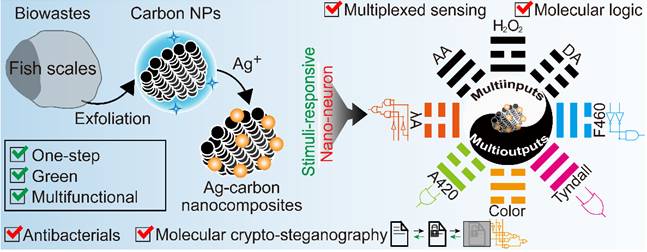 他们以废弃鱼鳞衍生的碳纳米颗粒(FSCN)为还原剂和稳定剂,通过直接和选择性催化Ag+为银纳米粒子(AgNPs),开发了一种简便、一步、温和、经济的银-碳纳米(AgNPs-FSCN)复合材料的制备方法。该复合材料具有先进的多功能性,显示出多维刺激响应能力(包括五个通道:颜色、廷德尔效应、吸收峰值强度和波长,以及荧光峰值强度),可用于重要生物分子(H2O2、抗坏血酸(AA)和多巴胺(DA))的多模多重检测以及高级信息处理和沟通。类似于生物感觉神经元,基于AgNPs-FSCN的系统具有可编程性和隐藏性,他们将其抽象为纳米神经元,实现了大规模并行分子逻辑计算和分子信息通信和安全(隐写术和密码术)。