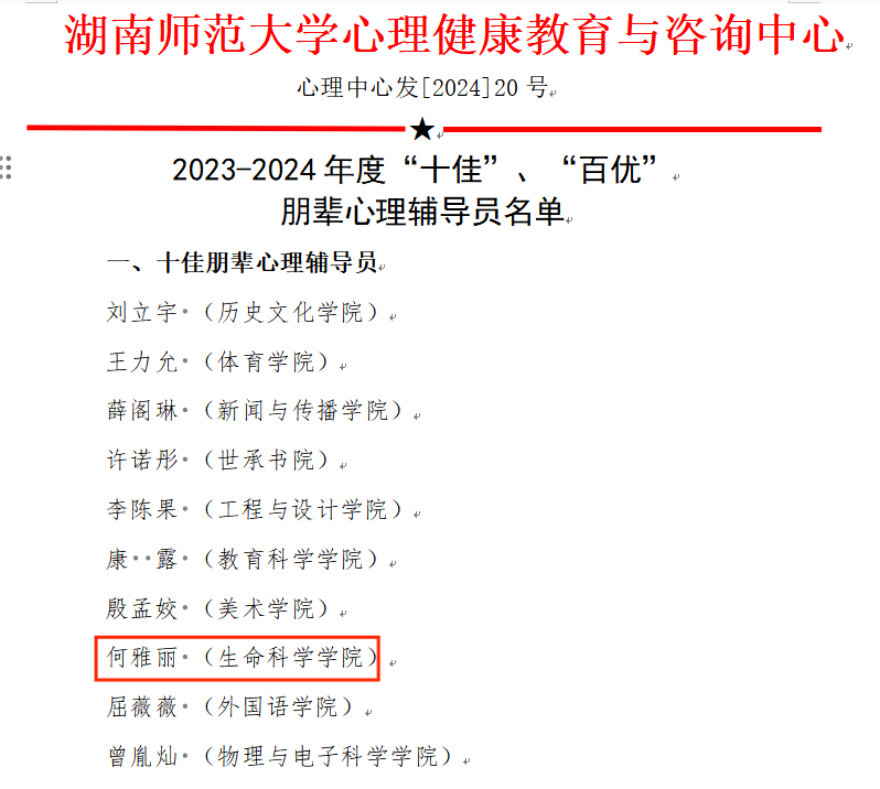 (通讯员 谢碧瑶 章超凡 曹晟)近日,湖南师范大学心理健康教育与咨询中心公布了关于表彰2023-2024年度“十佳”、“百优”朋辈心理辅导员的决定,通过学院推荐、校心理健康教育与咨询中心资格审核以及专家评审,我院2021级生科一班何雅丽获评“十佳朋辈心理辅导员”荣誉称号,2021级生科一班何雅丽、2022级生科三班章超凡、2022级生科四班梁雅菁获评“百优朋辈心理辅导员”荣誉称号。