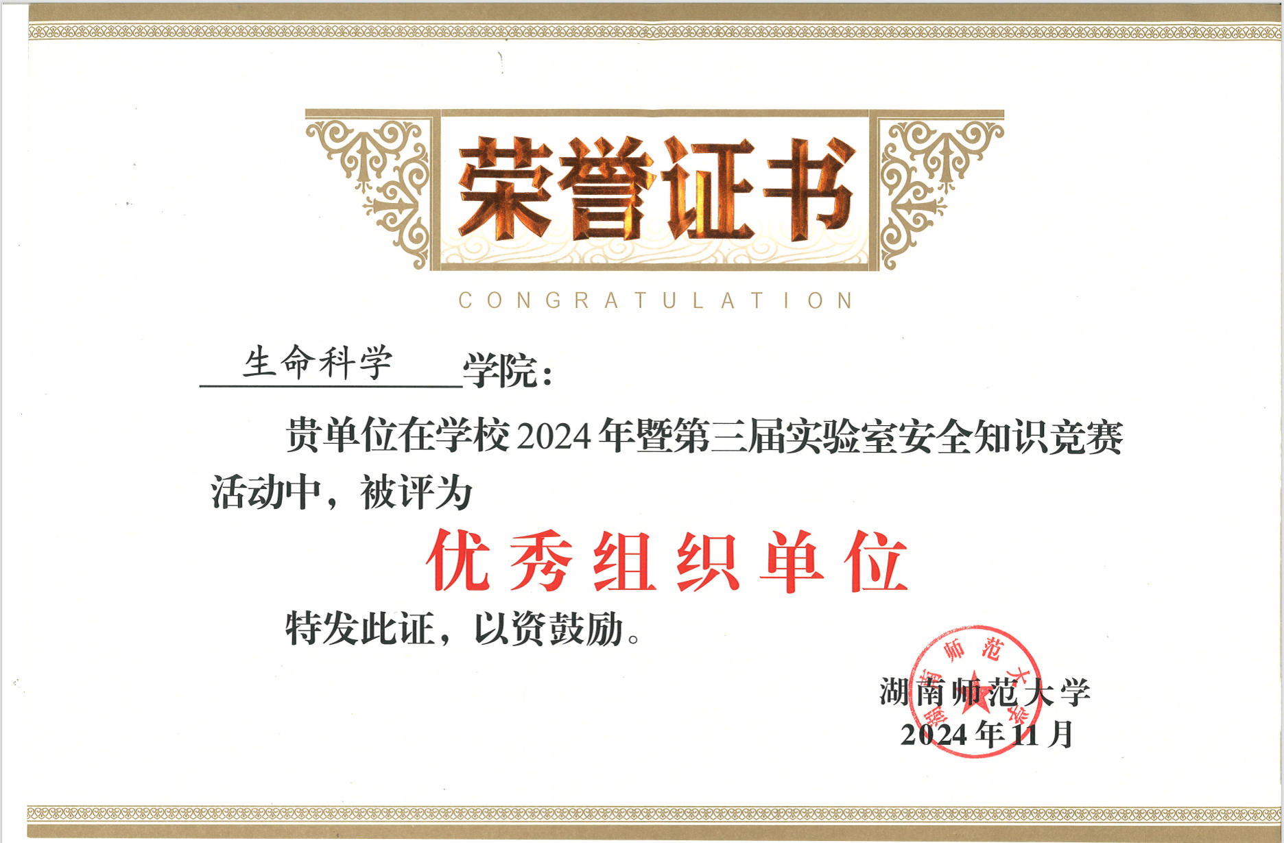 11月3日,湖南师范大学在国际学术报告厅举行2024年实验室安全知识竞赛决赛。学校副校长潘安练出席活动。我院在此次实验室安全知识竞赛中获得“二等奖”和"优秀组织奖",陈湘定教授获"优秀指导教师"。