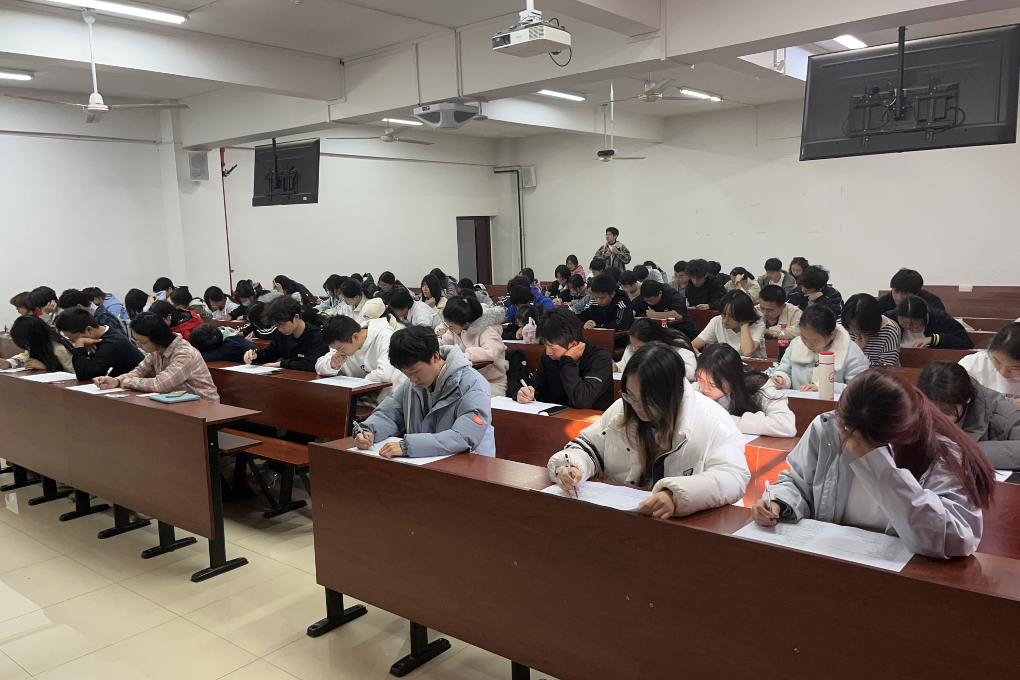 考试筹备阶段,工作人员提前抵达考场,完成场地布置、考生名单核对与试卷分发工作,并有序引导到场同学按指定座位就座。试卷分发完毕后,参赛同学迅速投入答题,考场内秩序井然。考试期间,工作人员全程巡回监考,既密切关注考生答题进度、严格维护考场纪律,也及时为有需求的同学提供协助,保障考试公平有序进行。