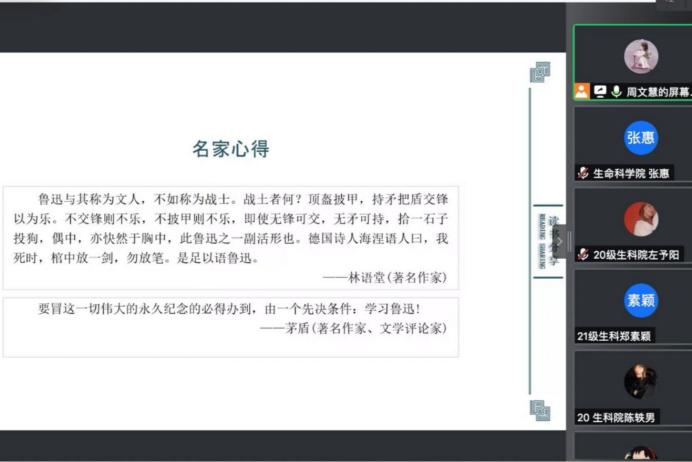 此次活动由介绍背景、了解作者、阅读作品、开展讨论、联系生活五部分组成。周文慧以《朝花夕拾》中某一片段的视频作为开端,以图示、好句分享、提出思考问题为主线,与评论员们一起置身封建社会,回忆鲁迅童年。评论员们联系当下,思考如何正确审视过去,走向未来。