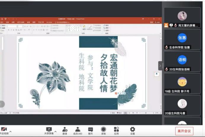 (通讯员 张惠)10月18日中午,生命科学学院、文学院与地理与科学学院于线上联合举办1+1读书会之“宏通朝花梦,夕拾故人情”。地科院周文慧担任此次活动主持人,评论员共同探讨鲁迅及其散文作品《朝花夕拾》。