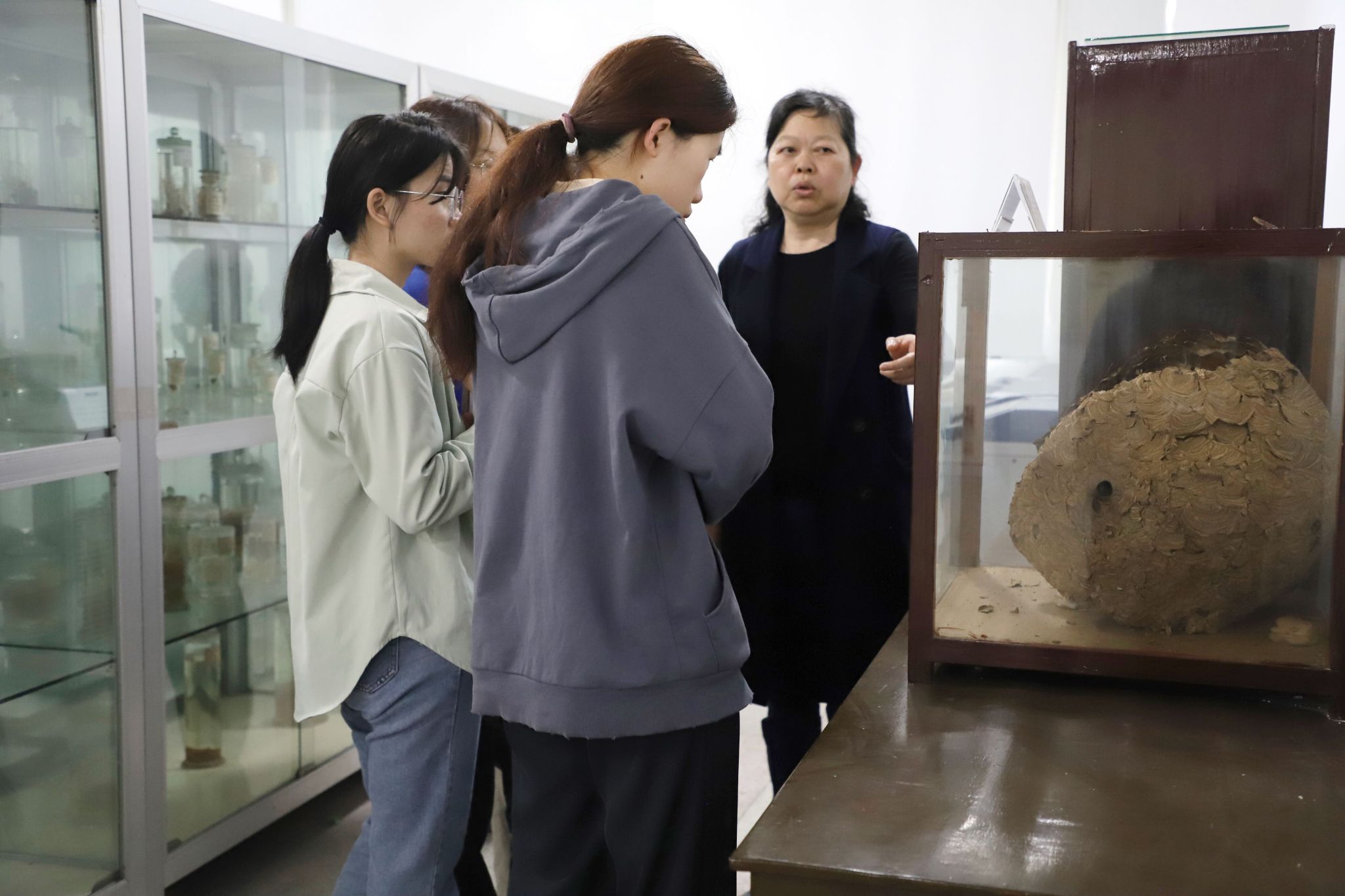 黎红辉带领志愿者前往无脊椎、脊椎动物标本陈列室,展开相关科普内容讲解。她结合提问的方式向志愿者们介绍标本物种、来历、濒危等级等,并说明标本既是科普教育的直观教具又是生物多样性锐减事实的真实记录,科普时应同时呼吁小朋友们善待自然,与自然和谐相处。