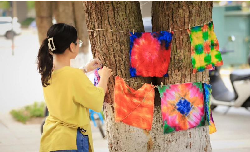 志愿者晾晒扎染作品