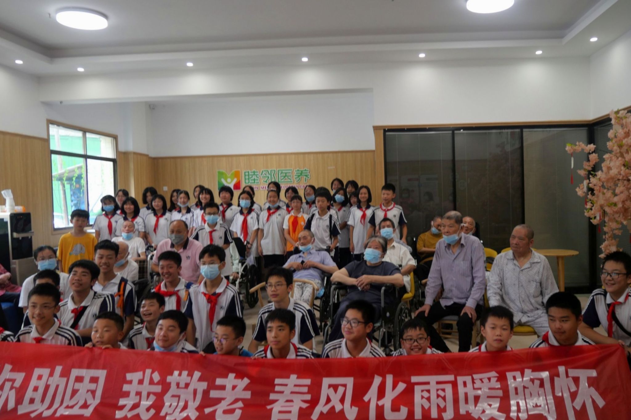 团队成员于敬老院活动大厅接待来自麓山国际实验学校的同学们并组织同学们于入口处签到。团队成员协助同学们为老人们开展才艺表演。表演内容包括红歌表演《我的中国心》以及诗歌朗诵《祖国啊,我亲爱的祖国》等。节目表演结束后,志愿者们分成两队,分别前往健身室陪伴老人们做手指活动操和在老人们房间与他们游戏互动。
