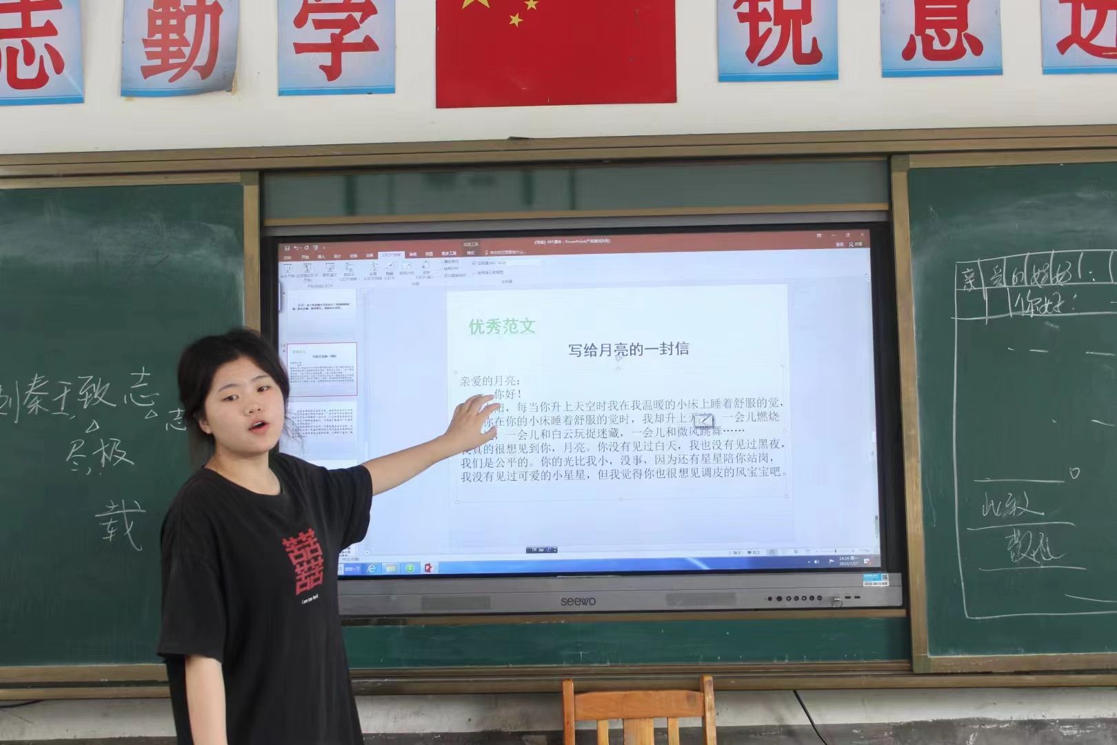 教学组成员提前准备课件与为学生写的信件,课堂上借助PPT向学生介绍信件的主要组成部分,包括称呼语、问候语、祝福语、落款,以及信件的具体格式,强调了对于不同的写信对象,需要应用恰当的称呼语和祝福语。教学组成员向学生们展示了数篇优秀范文,以便借鉴学习。学生们独立完成写信并制作礼物送给教学组成员,他们在信中表达出对教学组成员的不舍和感谢,并送上对教学组成员的祝福。
