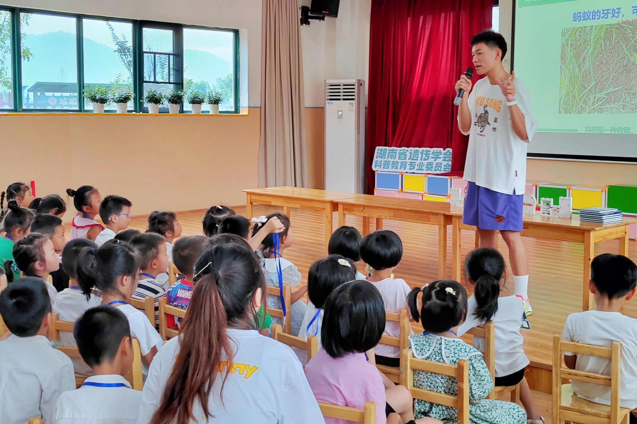 (通讯员 王俊龙 毛艺颖 沈莹)7月17上午,“奇趣科普,乡约盛夏”——湖南师范大学生命科学学院团委赴白箬铺镇胜河村暑期实践团队前往长沙市湘江新区白箬铺镇龙莲幼儿园开展“果园里的小‘蚂’哥”科普课程。2022级生科一班王俊龙和生科三班毛艺颖担任此次课程的主讲人。