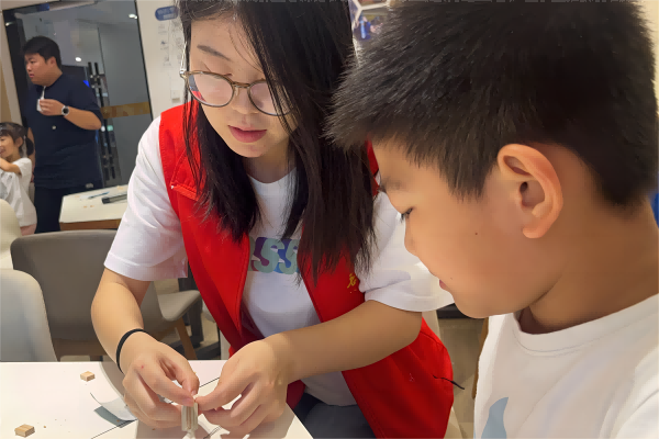 志愿者们提前达到活动场地,由场馆工作人员引领志愿者前往不同活动室协助开展活动。各个活动室的志愿者核实报名信息并组织报名活动的小朋友进行签到。志愿者黄敏萱、赵心悦等在活动“盲选阅读计划”中引导选好盲盒书籍的家长利用自助借书机借还书籍。部分小朋友跟随志愿者毛烨宇抽取题目答题,为提高小朋友参与的积极性,毛烨宇为答对5题的小朋友发放奖品。此外还有制作冰皮月饼、制作手工木头玩偶等活动。活动结束后,志愿者们合影留念,并对场馆进行打扫清洁。