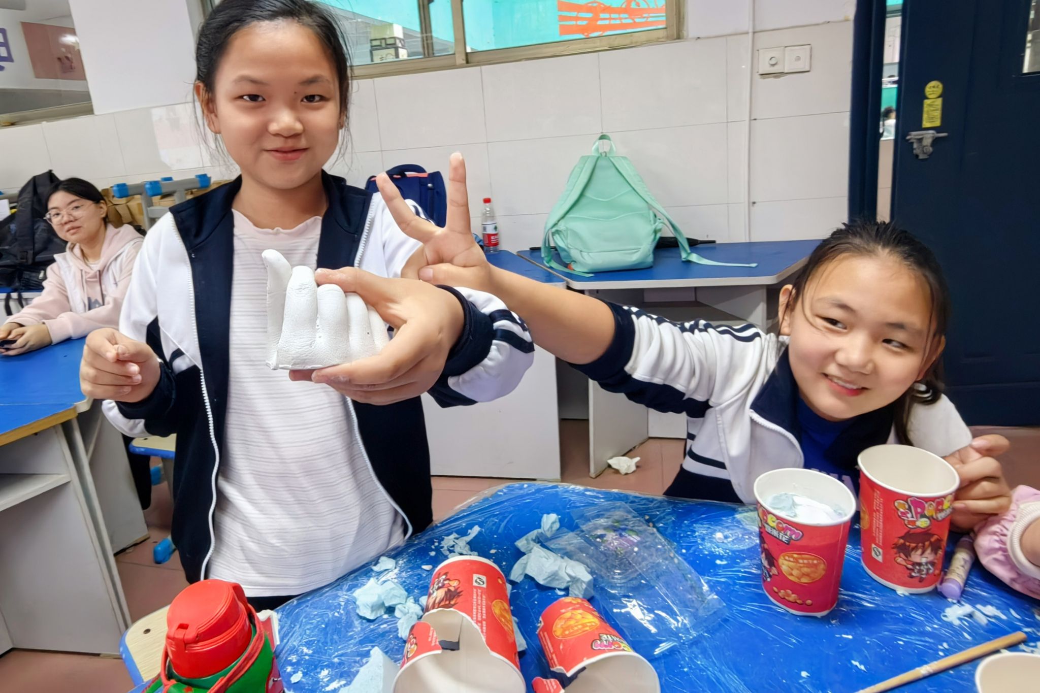 此次活动分为手膜制作的理论讲授和实践操作两个环节。罗众飞借助图片和视频向小朋友们讲述手膜的制作方法与注意事项,他说明制作手摸需配置模型腔和手模型,混合水与粉末时需均匀搅拌,并提醒小朋友们注意手膜粉的用量以及需将手垂直放入桶内,等待3到5分钟溶液变成蓝色且表面 Q弹时松动并取出手指。志愿者为小朋友们分发克隆粉、水和容器等相关材料,协助主讲人维持课堂秩序。在志愿者的帮助下,小朋友将手放入克隆模具中,摆出比心、握拳等不同的手势,制作出多样的创意手膜。