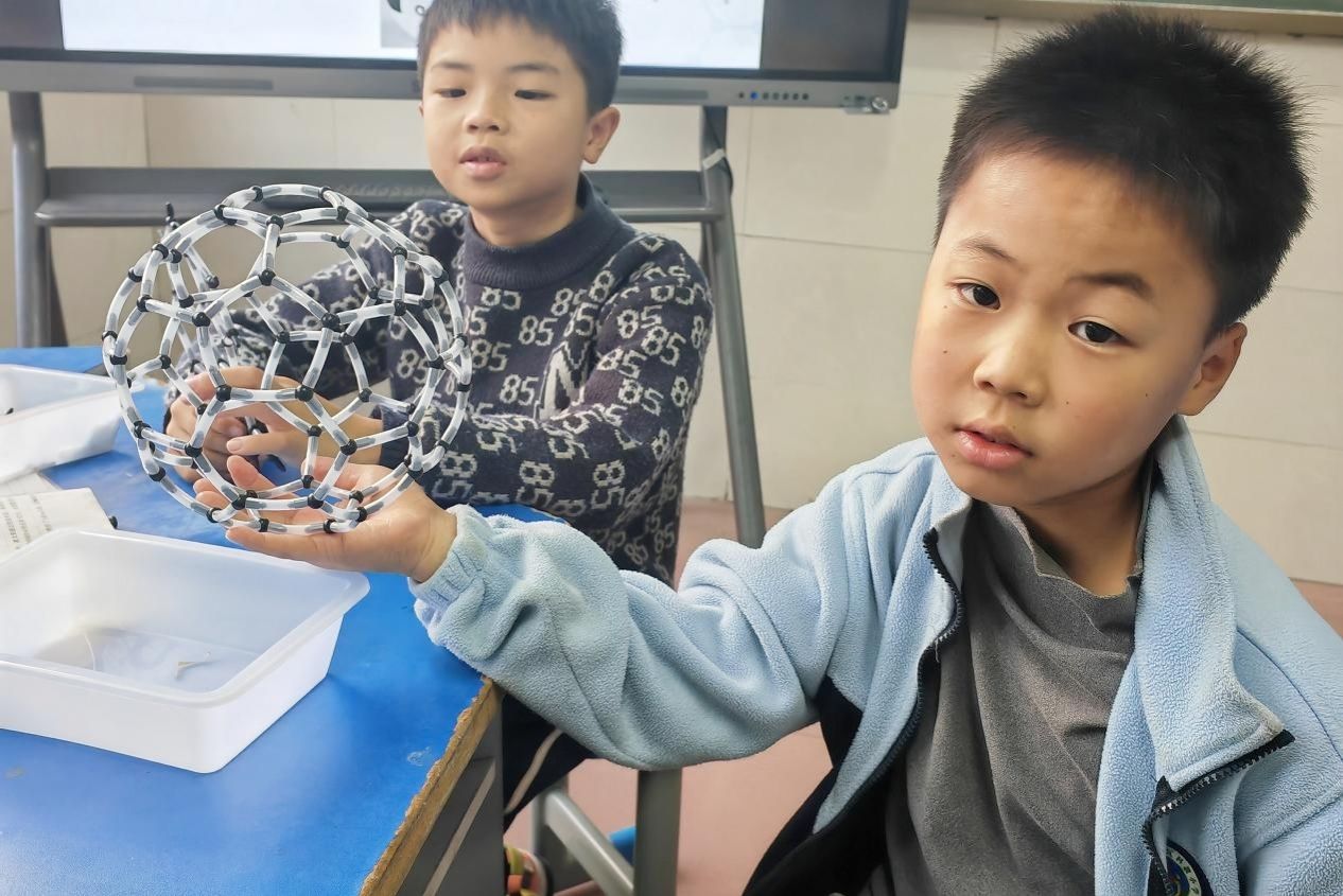 此次活动分为碳元素相关知识介绍和新型材料C60模型制作两个部分。主讲人向小朋友们解释碳循环的定义,并通过碳循环示意图讲解碳循环的基本过程。主讲人还通过PPT和视频相结合的形式向小朋友们介绍碳的常见氧化物CO2和CO的物理、化学性质。她表示CO2在常温下无色无味,密度大于空气;而CO在常温下无色无味且有毒,密度小于空气。同时,主讲人讲解新型材料C60模型的制作步骤以及注意事项,并使用物理模型进行介绍,让小朋友对C60的球形32面体结构有更深入的了解。随后,志愿者们为小朋友们分发软管、三角球等相关材料,并协助小朋友按步骤制作C60模型。小朋友表示,通过制作和观察模型,对C60的空间结构有更清晰的认识。