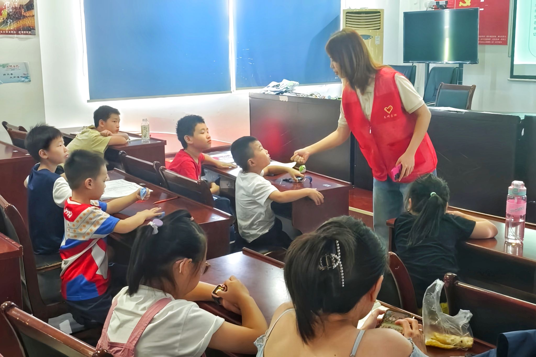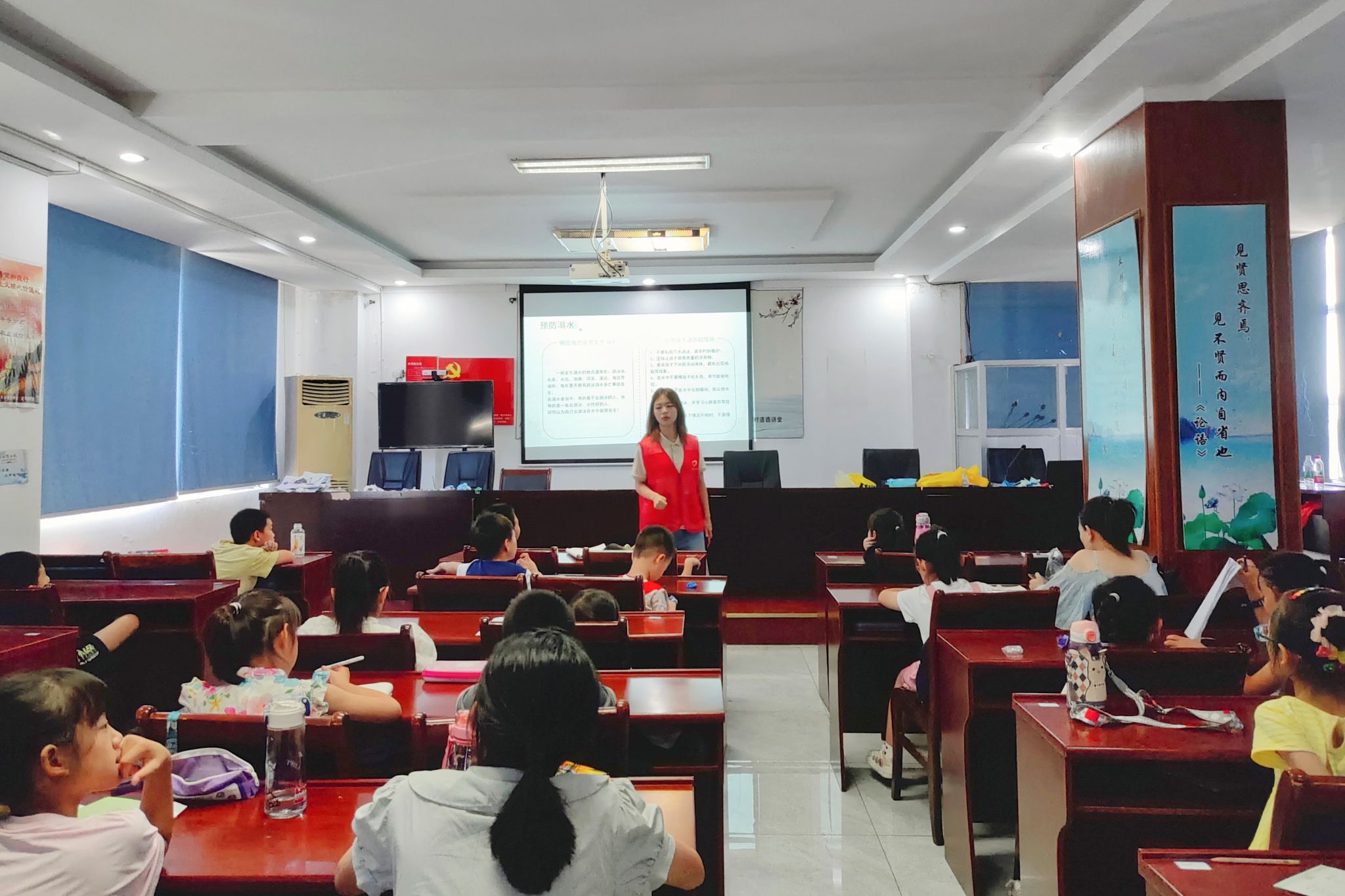 活动分为观看视频、互动问答和齐唱《防溺水安全歌》三个部分。主讲人为小朋友播放溺水急救视频,为小朋友普及溺水急救知识,并说明珍惜生命、严防溺水的重要性。在互动问答环节,她询问小朋友游泳技能的掌握情况,告知小朋友提高警惕,不可盲目施救,并提醒他们游泳时一定要有家长陪同。她让小朋友回答遇到他人或自己溺水情况时的正确做法。小朋友利用此次活动所学知识,认真回应主讲人的提问。最后,主讲人带领小朋友学唱《防溺水安全歌》,歌曲旋律简单且包含溺水注意事项,便于小朋友牢记。