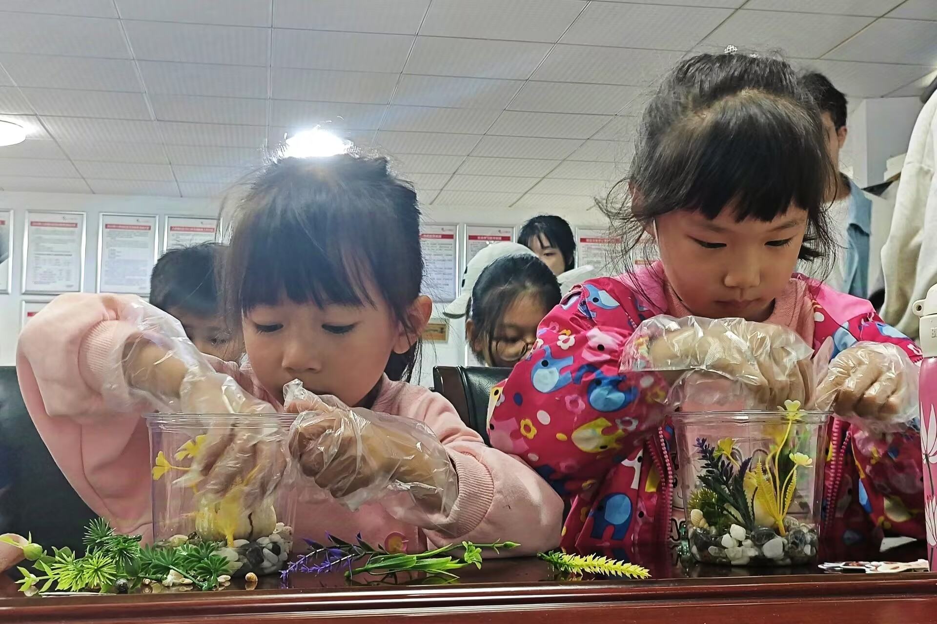 此次活动主要分为介绍水仙花相关知识和制作水培水仙花两个部分。贺橙子借助ppt和歌曲向小朋友们介绍水仙花的传说、外形、花语和栽培注意事项。例如,水培水仙花的水不能超过鳞茎的三分之一,前十几天要每天换水,栽培时不用特地施肥等。贺橙子解释水仙花鳞茎的汁水具有毒性,水仙花的气味也会使人产生中毒症状。同时,贺橙子以提问的方式与小朋友们进行互动并给予小奖品来提高小朋友的积极性。在实践部分,志愿者们为小朋友们分发了装有铺面石的咖啡杯作为水培容器,各种假花、贴纸、小海螺作为装饰和处理好的水仙种球,并协助他们完成水培水仙的制作。