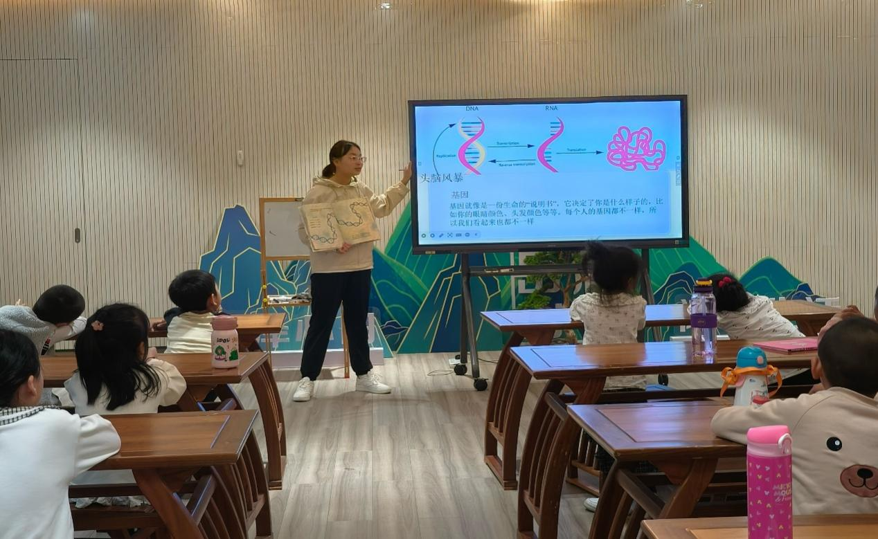 志愿者由现实生活中的现象引入,为小朋友们讲解有关DNA和RNA的相关故事、定义及其在遗传过程中的重要意义。志愿者们以头脑风暴的形式组织小朋友们进行思考讨论,同时向小朋友们提出问题。小朋友们积极思考做答,并根据个人的思考向志愿者提出问题,志愿者们耐心解答。基因拼图游戏环节,志愿者组织小朋友们分组拼凑基因图案,挑选表现优秀的拼图进行成果展示,加深小朋友们对基因结构的认识。