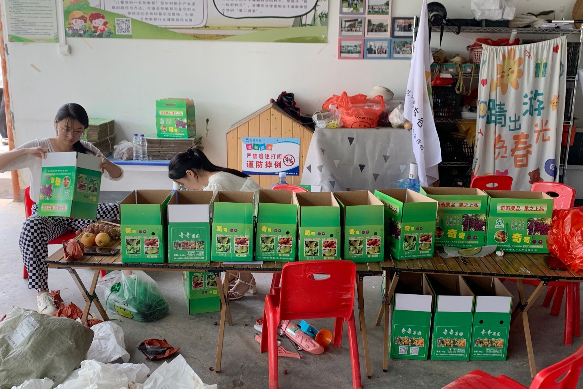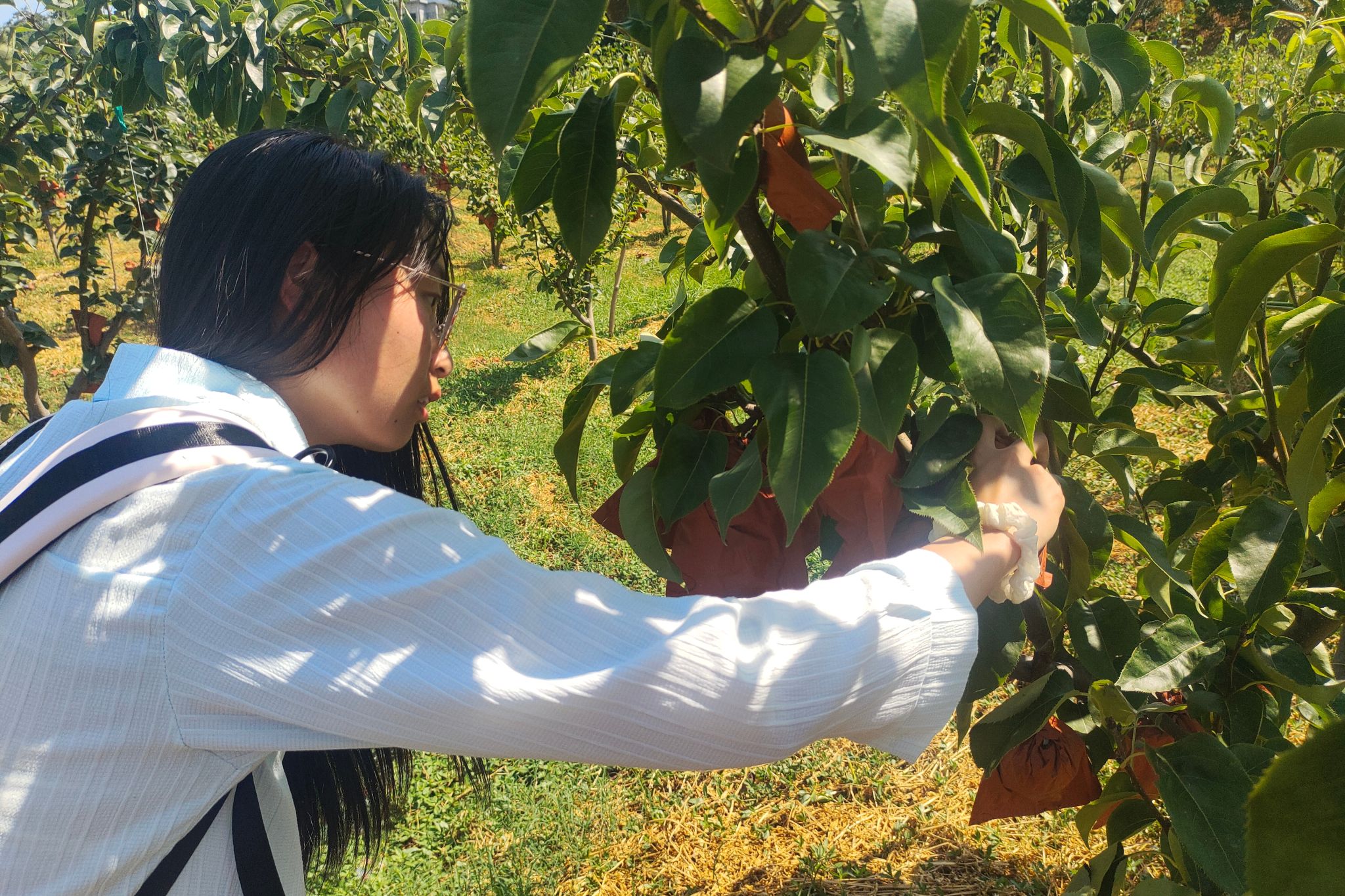 奇奇果园基地水果种类丰富,以梨子、桃子、葡萄为主。在采摘之前,团队成员进行了前期的培训,学会如何分辨熟果好果以及如何采摘不伤果等基本采摘知识。在果农的指导下,实践团成员们迅速掌握了摘果技巧,并通过分工合作,将大小合适的熟果采摘挑选装箱。采摘后的水果搬运到打包场地后需进一步筛选,有瑕疵的烂果坏果会被挑选出去,以保证果园基地销售水果产品的质量。同时,不同大小和品质的水果将会被分选到不同的盒子里以作区分。
