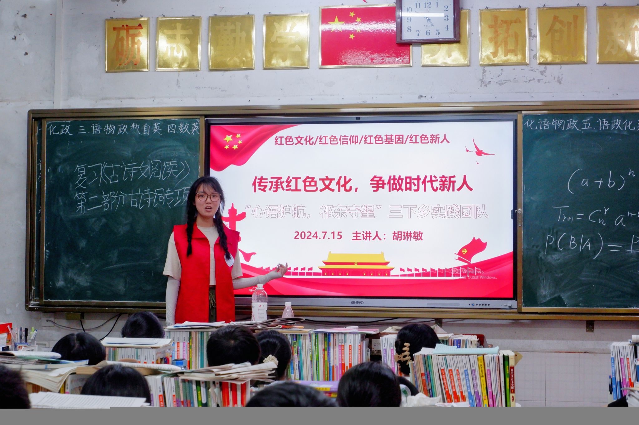 (通讯员 田灿 胡琳敏 谭雯婧)7月15日下午,生命科学学院“心语护航,祁东守望”三下乡实践团队于祁东二中举办“传承红色文化,争做时代新人”主题活动。宣传组组长胡琳敏担任主讲人。