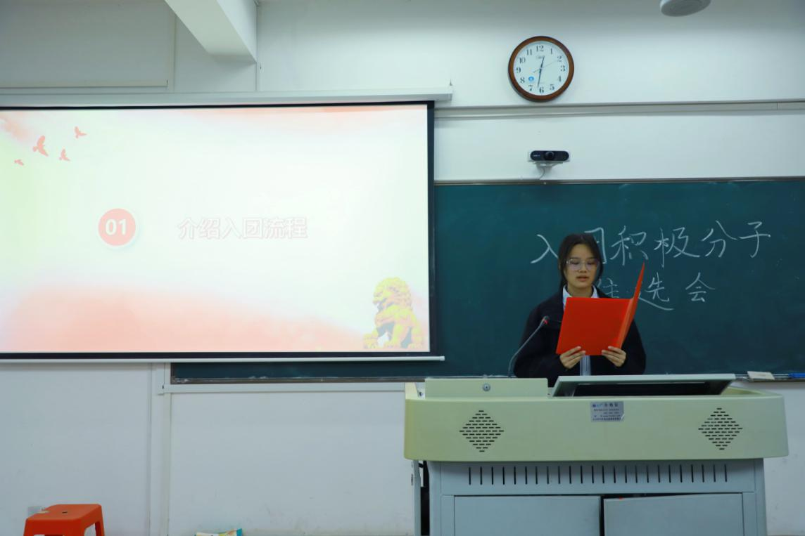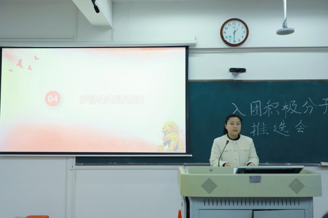 主持人介绍入团流程分为申请入团、入团积极分子的确定、教育培养和考察、发展对象的确定、新团员的接收五个阶段。随后,主持人宣读生科院2025年入团积极分子候选人名单。入团积极分子候选人分别上台进行思想汇报,汇报中提到他们在学习、生活以及思想上不断的向团员标准靠拢,表达自己对于团身份的期盼并作出承诺。罗静伟在讲话中号召同学们在思想上要不断学习党组织与团组织的理论,不断提高自身的思想觉悟,同时,她鼓励同学们参与社会实践活动,培养自己的社会责任感。