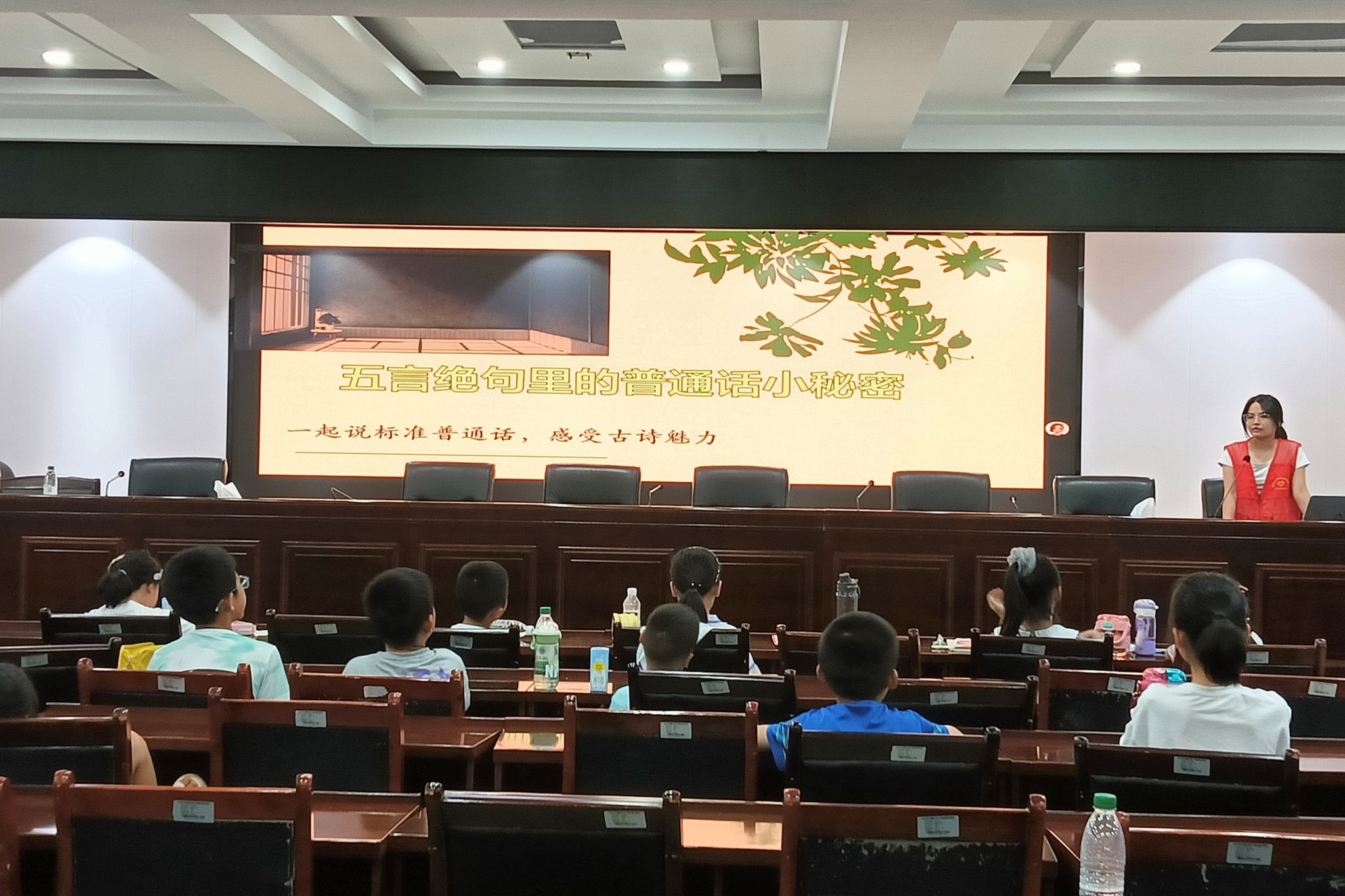 主讲人向学生们系统讲解五言绝句的相关知识。她明确指出,五言绝句是由四句构成、每句五字的诗歌体裁,并详细阐释其基本结构。同时,主讲人介绍了押韵的定义,阐明押韵在五言绝句中的作用。为加深学生们的理解,主讲人带领大家一同朗读经典五言绝句,及时纠正学生在朗读中出现的发音问题,引导他们饱含情感地诵读诗歌,学生们均积极参与该环节。此外,主讲人通过播放趣味视频的方式,让学生认识到学习普通话的重要意义。她借助绕口令互动环节,激发学生对说好普通话的兴趣,引发他们对普通话学习的深入思考。