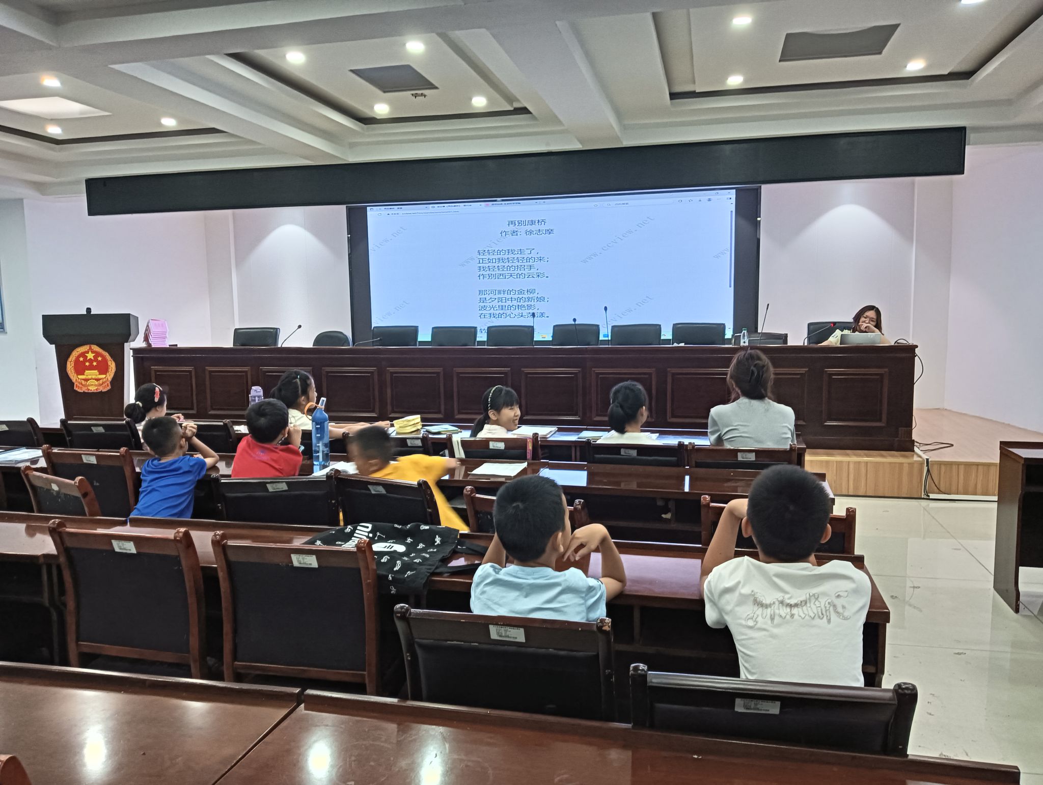 活动伊始,主讲人组织同学们通过抽签确定彩排上台顺序。同学们按组别依次登台进行彩排演练。主讲人全程关注台上小朋友的表现状态,针对节目效果提出优化建议,助力提升节目质量。实践团其他成员协同配合,负责维护现场秩序,保障彩排活动有序推进。在诗歌朗诵练习环节,小朋友认真跟读和朗诵屏幕中《再别康桥》的文稿内容。随后,进入大合唱练习环节,志愿者指导小朋友调整音高和音准,小朋友们的歌声在伴奏中整齐响亮。小朋友们均以认真积极的态度参与彩排,反复练习歌曲唱词与诗歌篇目。彩排活动结束后,小朋友们信心倍增,对即将到来的结营仪式满怀期待。
