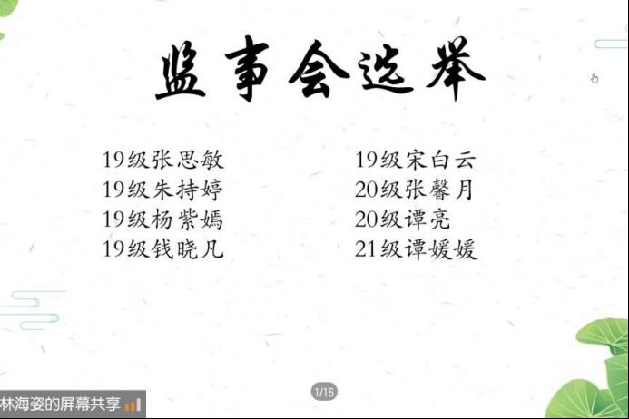 此次会议分为理事会介绍、监事会选举及支部团员会议三个部分。林海姿从基础设计、特色设计和互动设计三个方面向会员介绍三叶草园艺社。理事会成员依次进行了自我介绍。随后林海姿以文字和图片的方式介绍了监事会的职责并以线上投票的方式进行了监事会选举。