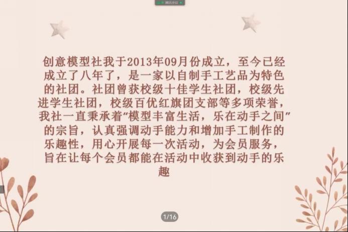 (通讯员 张馨月 庾雪菲 赵婧)11月13日下午,生命科学学院创意模型社举行线上会员动员会议。生科院创意模型社理事张馨月担任此次会议主讲人。