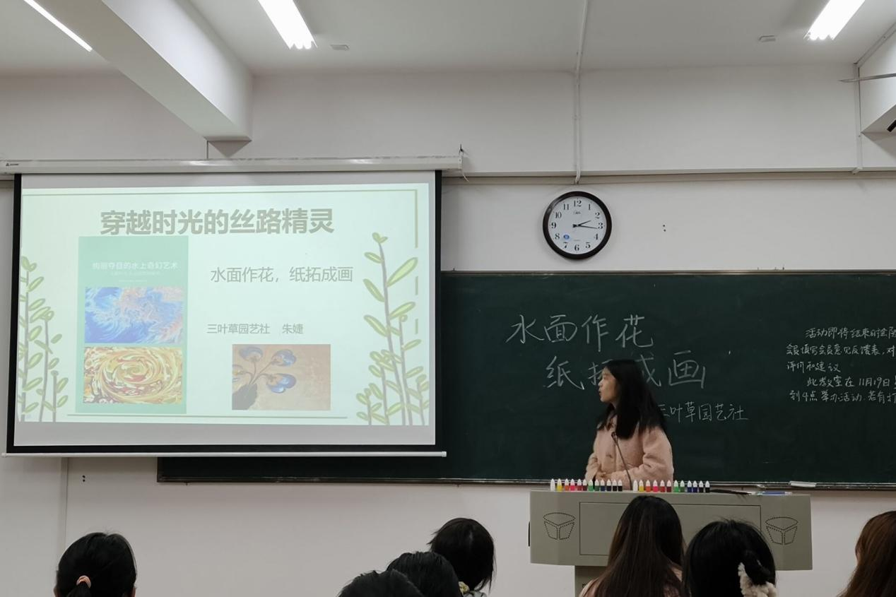 (通讯员 伍鼎载 谭莎莎)11月19日下午,生命科学学院三叶草园艺社于生科院B108教室举办“水面作花,纸拓成画”手工活动。生科院三叶草园艺社理事朱婕担任此次活动主讲人。