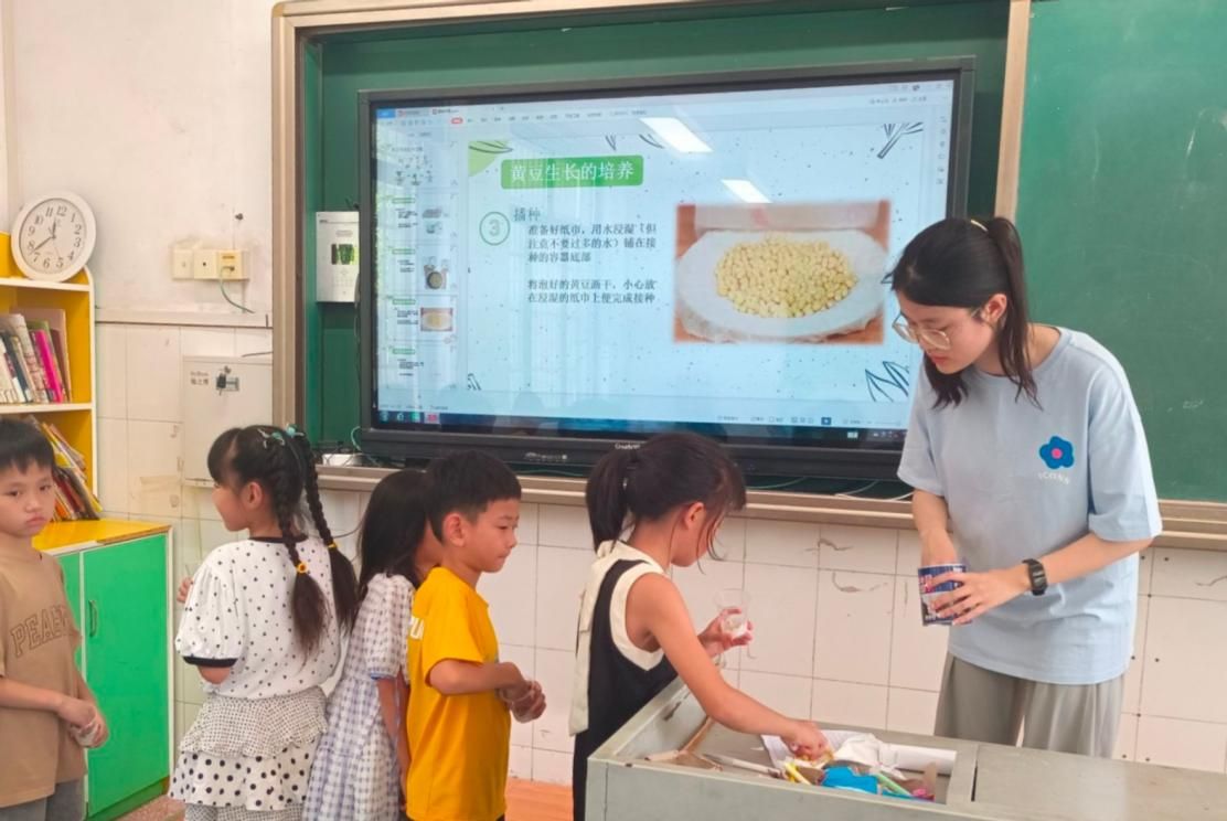 此次课程由老师讲解黄豆水培原理、学生动手实践以及老师验收成果三个部分组成。孙亚茹带领同学们认识黄豆,初步了解黄豆的生长环境与生长条件。同学们领取黄豆种子,对黄豆种子进行挑选,将发颜色不健康的、不成形的黄豆种子筛选出来。同学们在老师的指导下按照种植步骤制作培养瓶,在培养瓶底部铺一层湿纸巾,将适量的黄豆放入培养瓶中,将湿纸巾铺到黄豆上。学生进行成果展示,老师布置同学们每日进行黄豆观察日记书写和发芽进程绘画。