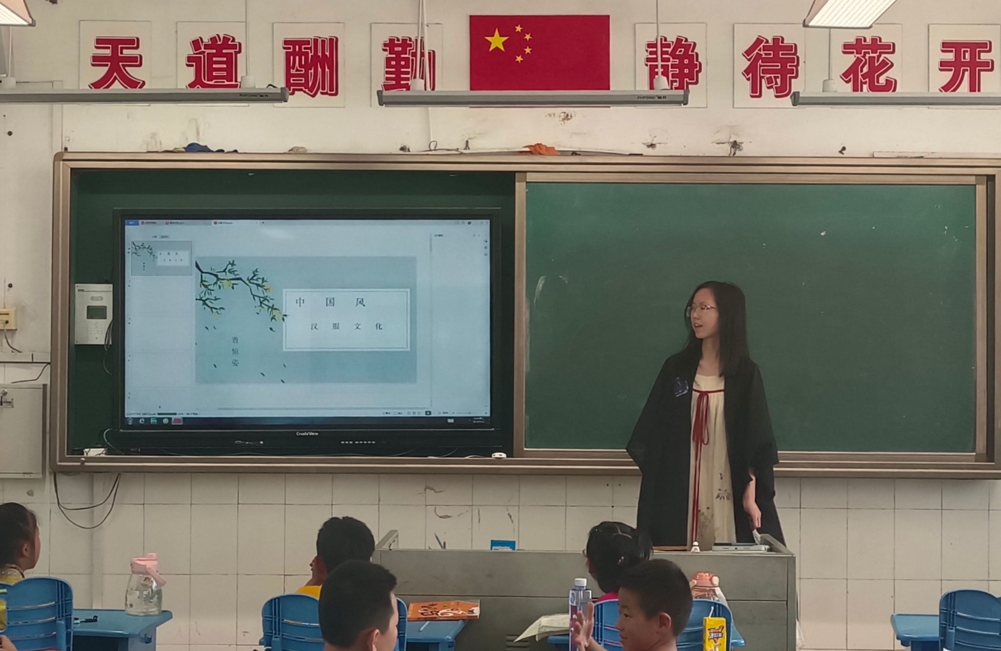 此次课程在二年级和四年级开展,由老师讲解汉服礼仪文化和形制特点、学生制作手工汉服、老师验收成果三部分组成。孙亚茹为学生讲解汉服礼仪文化,带领学生感受不同朝代汉服礼仪的演变,她强调汉服文化反映的是儒教礼典服制的文化总和。曹惊姿从流行花纹、颜色两方面向学生介绍不同时期汉服的形制特点,探讨汉服形制演变背后的历史文化原因,带领学生深入思考并感受中华传统文化之美。学生模拟汉服打版、裁剪和上色等工艺,根据汉服形制特点制作汉服手工作品并展示。
