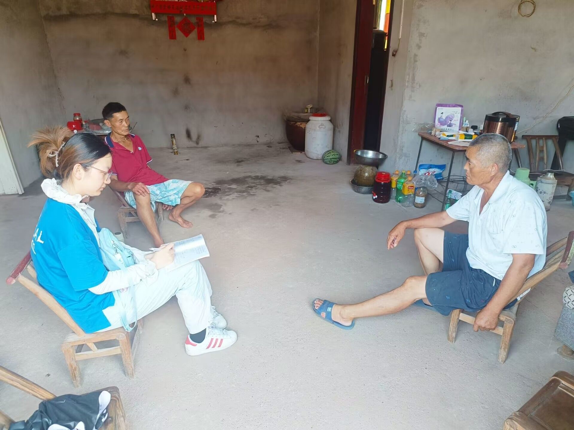 沙湾组组长张中玉向成员们讲述了近些年以来沙湾组发展的实际情况——组中居民多是空巢老人,青年及青壮年大多外出务工,老人们随着年龄的逐渐增大,做农活也渐渐力不从心,以前还能到城里去卖菜补贴家用。现今种的菜很少有多余的,且交通的不便利,去城里的次数也逐渐变少了,家里的开支则几乎是由儿女外出务工得来。年纪大多年过七旬,儿女们也不能时常陪伴在自己身边,内心的孤独感是在所难免的。