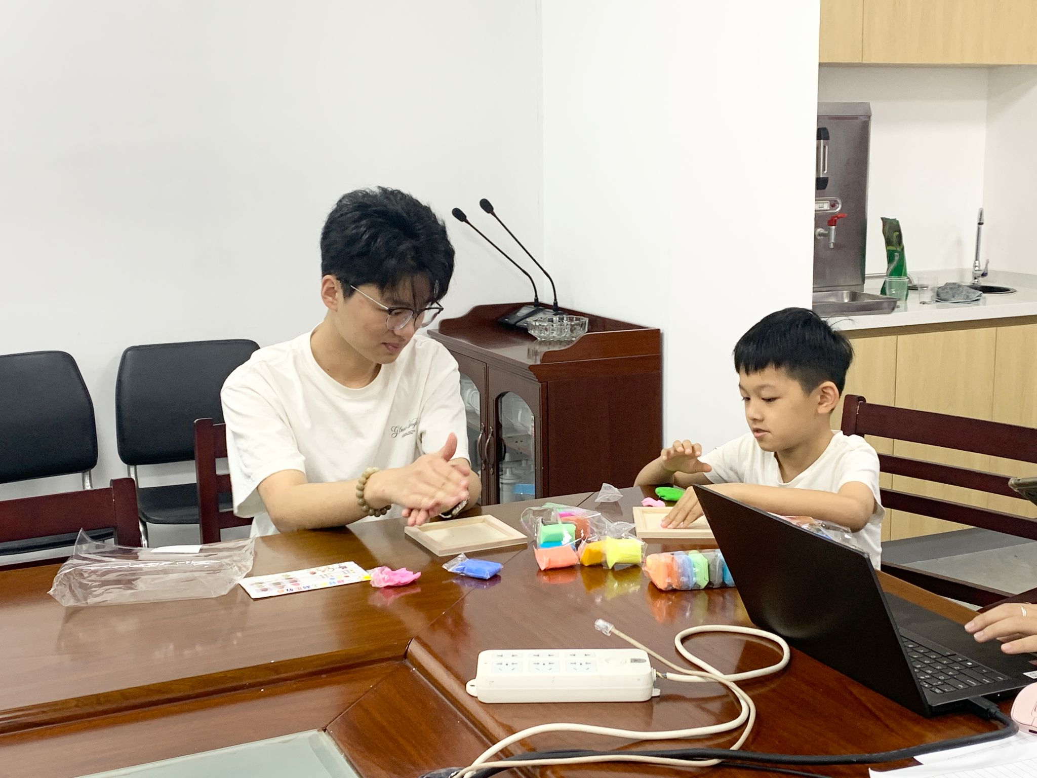 此次活动由动物知识科普、挤挤猪相框制作和知识抢答三部分组成。主讲人通过PPT的形式介绍日常生活中常见动物的特征,如猪的大鼻子、兔的长耳朵和鱼的流线型身体等,并为小朋友们讲解制作相框的步骤,即泥绘、固定以及封合。志愿者为小朋友们分发彩泥相框等材料,帮助小朋友使用彩泥捏出鹰、猪等动物,待其硬化后将其放进相框中,制作出成品。随后,志愿者们与小朋友进行看图猜动物知识抢答,并合影留念。