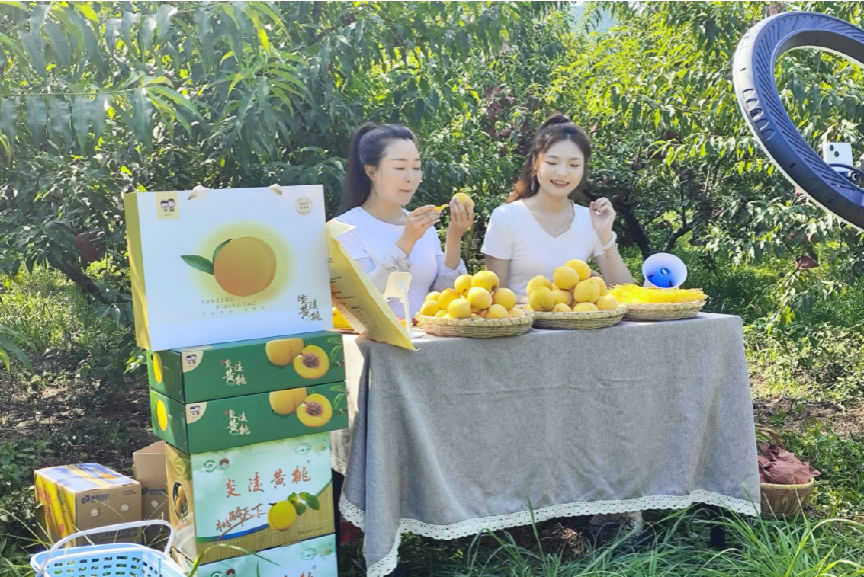 实践团成员在禾仓源村采摘黄桃,并前往种植基地了解黄桃种植技术、品质控制及市场销售策略。在与当地种植专家及销售人员的交流中,团队获得许多种植技术资料。种植专家表示这些资料为后续的调研报告及推广方案奠定基础。成员们前往当地直播带货现场,了解当地推广产品的新型销售模式。现场销售人员为成员们介绍带货过程中的一些技巧,如需要准备足够的产品实物进行展示,带货时需要适时与直播间互动等。随后,成员们与种植专家合影留念。