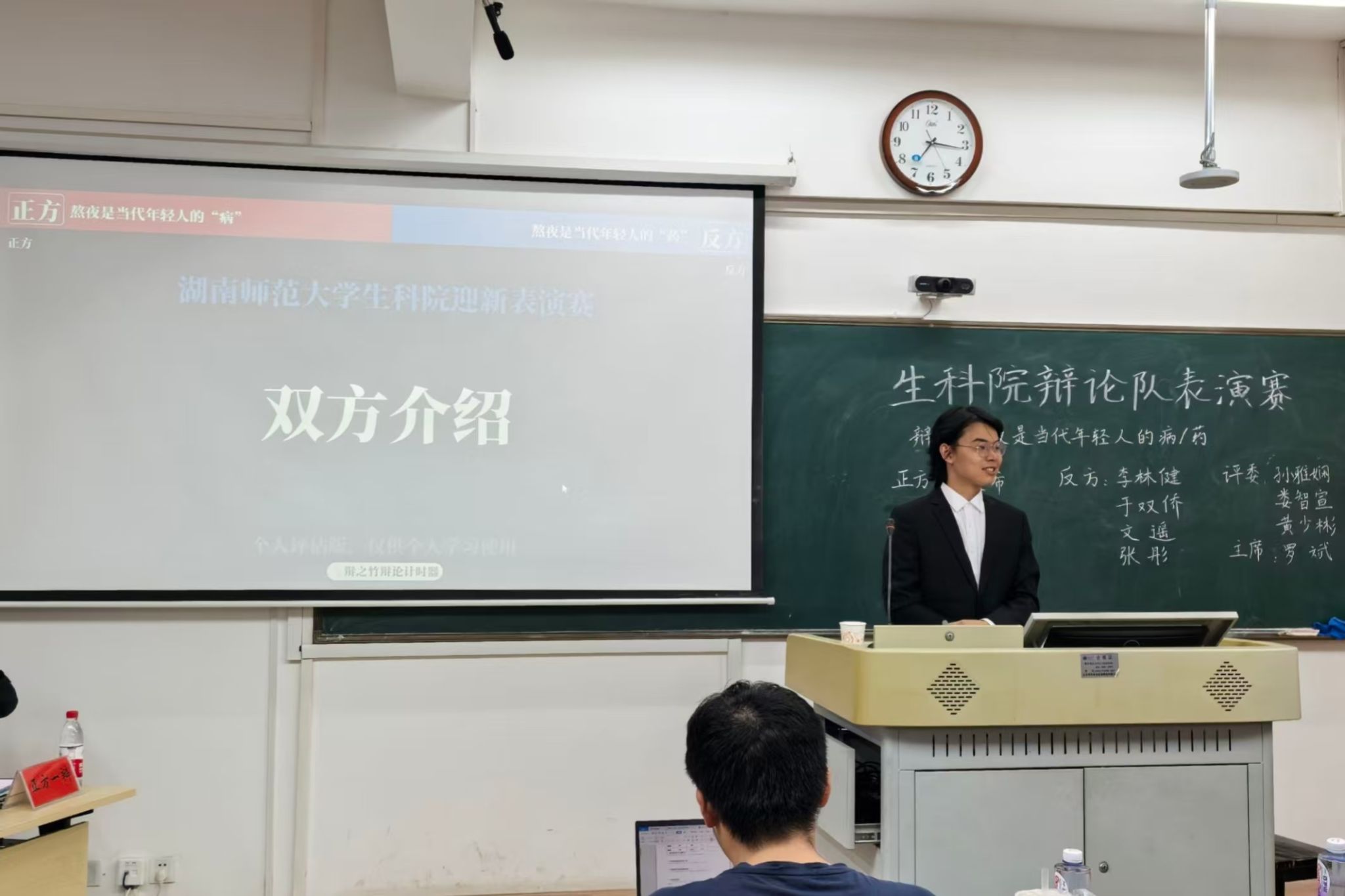 (通讯员 田灿 张彤)9月20日晚上,生命科学学院辩论队于生科院三号楼b107教室举办迎新辩论表演赛。辩论队队员罗斌担任此次比赛主持人。生科院2022辩论队队长黄少彬、副队娄智宣,生科院2021级副队孙雅娴担任此次比赛评委。生科院辩论队2023级全体成员参与,2022级、2023级、2024级部分学生观赛观赛。