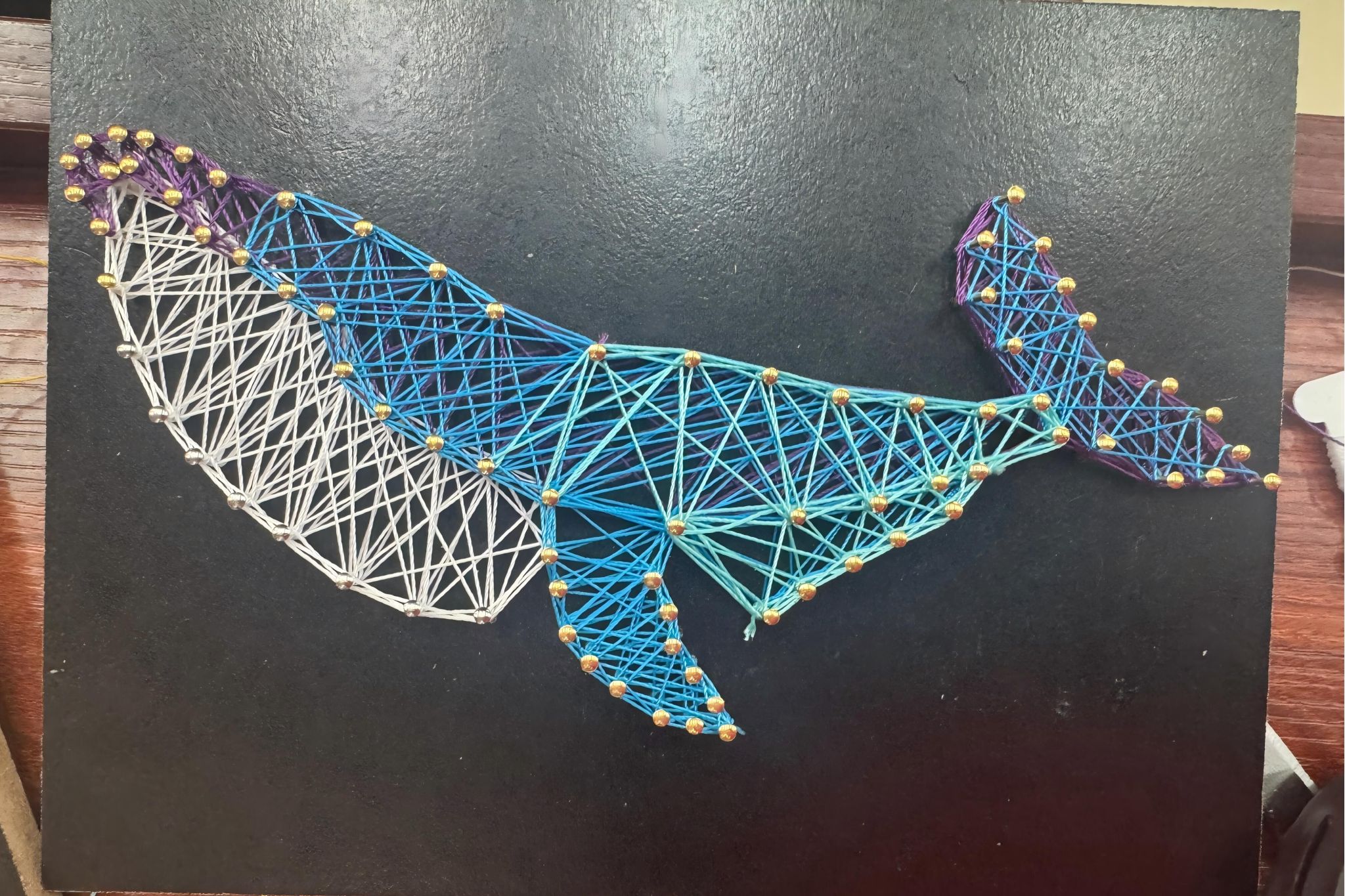 主讲人结合优秀绕线作品进行讲解,重点介绍绕线画的设计转印、钉孔定位、绕线手法及收尾处理全流程,并提醒要安全规范使用工具。通过主讲人的讲解,同学们了解到钉子定位和绕线逻辑是决定绕线画画面工整度的关键步骤。在社团工作人员全程协助下,同学们领取木板、丝线、钉锤等材料,针对绕线松紧、图案把握等实际问题进行探讨,发挥创意,完成绕线画作品。所有作品均被拍照留念,并进行装裱养护。