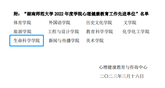 (通讯员 王乐怡)近日,学校公布2022年度学院心理健康教育工作先进单位”名单。经学校评审,生命科学学院荣获湖南师范大学“2022年度学院心理健康教育工作先进单位”。
