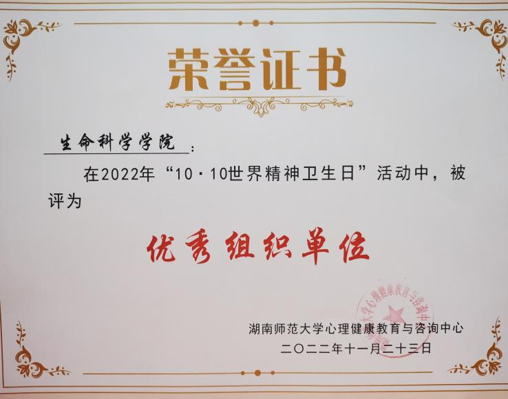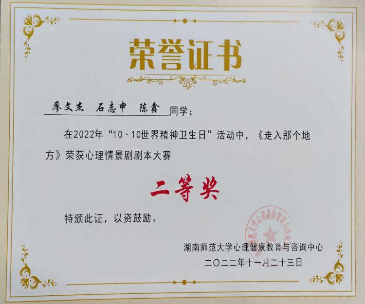 (通讯员 何雅丽 王乐怡)近日,学校公布湖南师范大学2022年“10.10世界精神卫生日”活动的获奖名单。经学校评审,生命科学学院荣获优秀组织单位,2022级廖文杰、石志申、陈鑫的共创的《走入那个地方》获得“心理情景剧剧本大赛”二等奖。