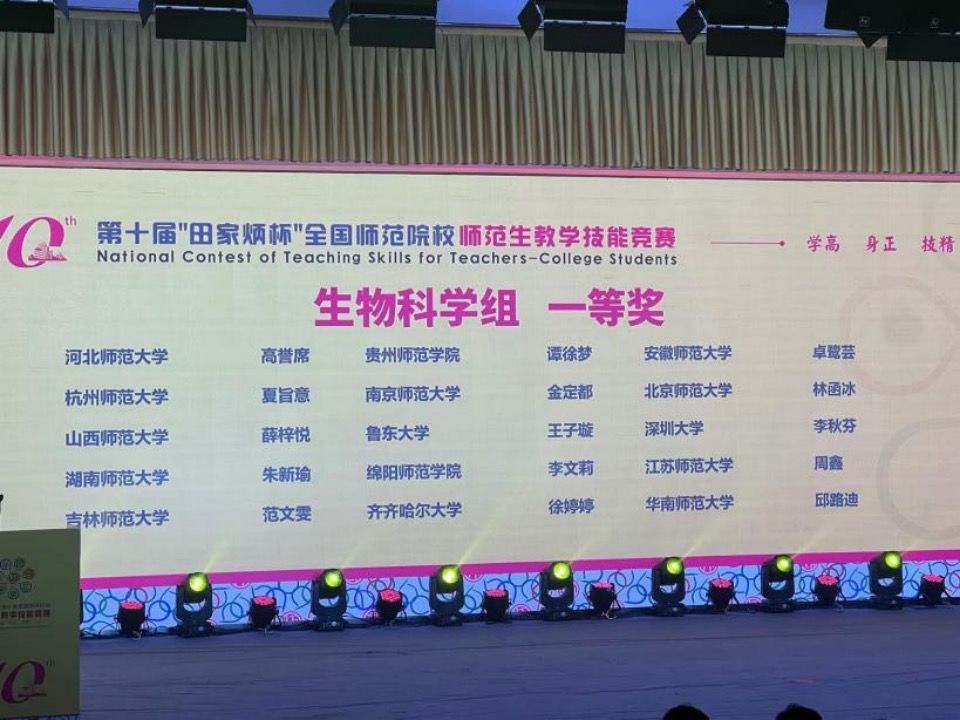 (通讯员 邱靖雯 朱新瑜)11月29日-12月1日,由浙江师范大学主办,全国地方高等师范院校教务处长联席会议提供专业指导,田家炳基金会冠名赞助的第十届“田家炳杯”全国师范院校师范生教学技能竞赛顺利举行。经过教学设计和多媒体课件制作、即席讲演与模拟上课、板书等各环节的激烈角逐,生科院学子2021级生物科学(师范)专业朱新瑜同学荣获生物科学组全国一等奖,总分排名为全国第四。
