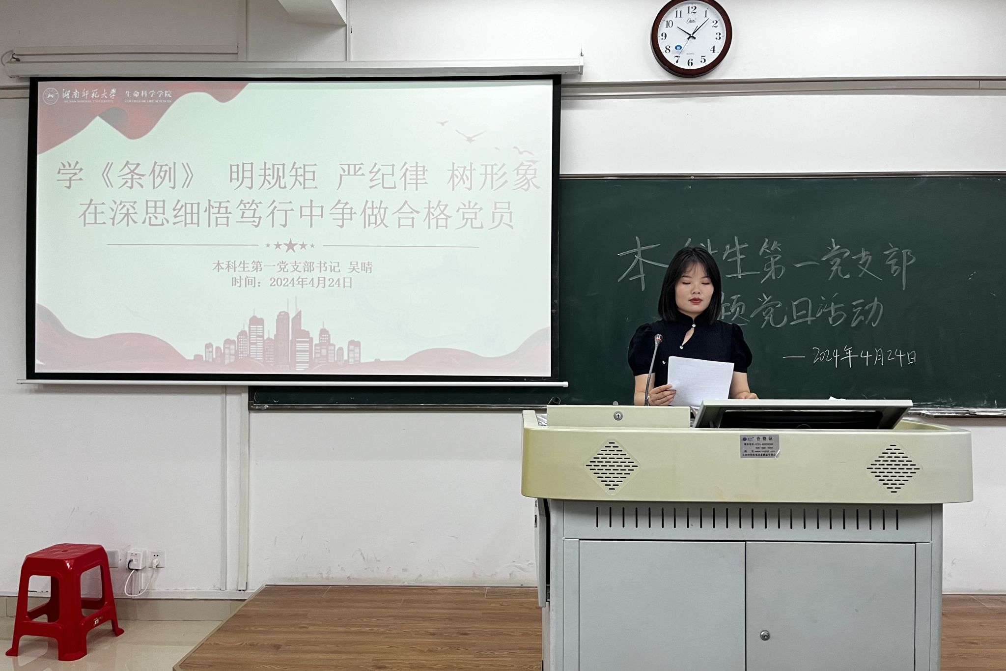 活动伊始,各支部书记通过讲党课的形式,认真传达了中共中央办公厅《关于在全党开展党纪学习教育的通知》(中办发〔2024〕34号),向与会党员同志从重要意义、主要内容、《条例》学习重点、《条例》全文学习要求等五个方面解读。吴晴强调:“要把党纪学习作为终身“必修课”,不断拧紧思想阀门、上紧规矩发条,把党规党纪内化于心、外化于行,始终做到忠诚干净担当。”
