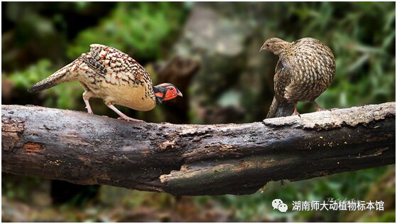 湖南师范大学动植物标本馆有黄腹角雉标本4件,其中雌雄一对,八十年代购买于福建福州。另外2个的黄腹角雉标本由我院沈猷慧教授1984年在湖南郴州宜章采得并制成标本,2000年在动物学研究中《湖南省鸡形目鸟类及其分布》一文有记载。沈先生发现黄腹角雉除了湖南郴州的宜章有分布外,还见于炎陵、汝城、江永、临武、新宁等南岭山地,生活在800-1600m常绿阔叶林带。由于在南岭山地一带连续分布,因此浙江、福建、江西、湖南、广东和广西黄腹角雉分布连成一片,比原记录向西扩展达到雪峰山地区。黄腹角雉标本均保存在湖南师范大学动物标本馆。