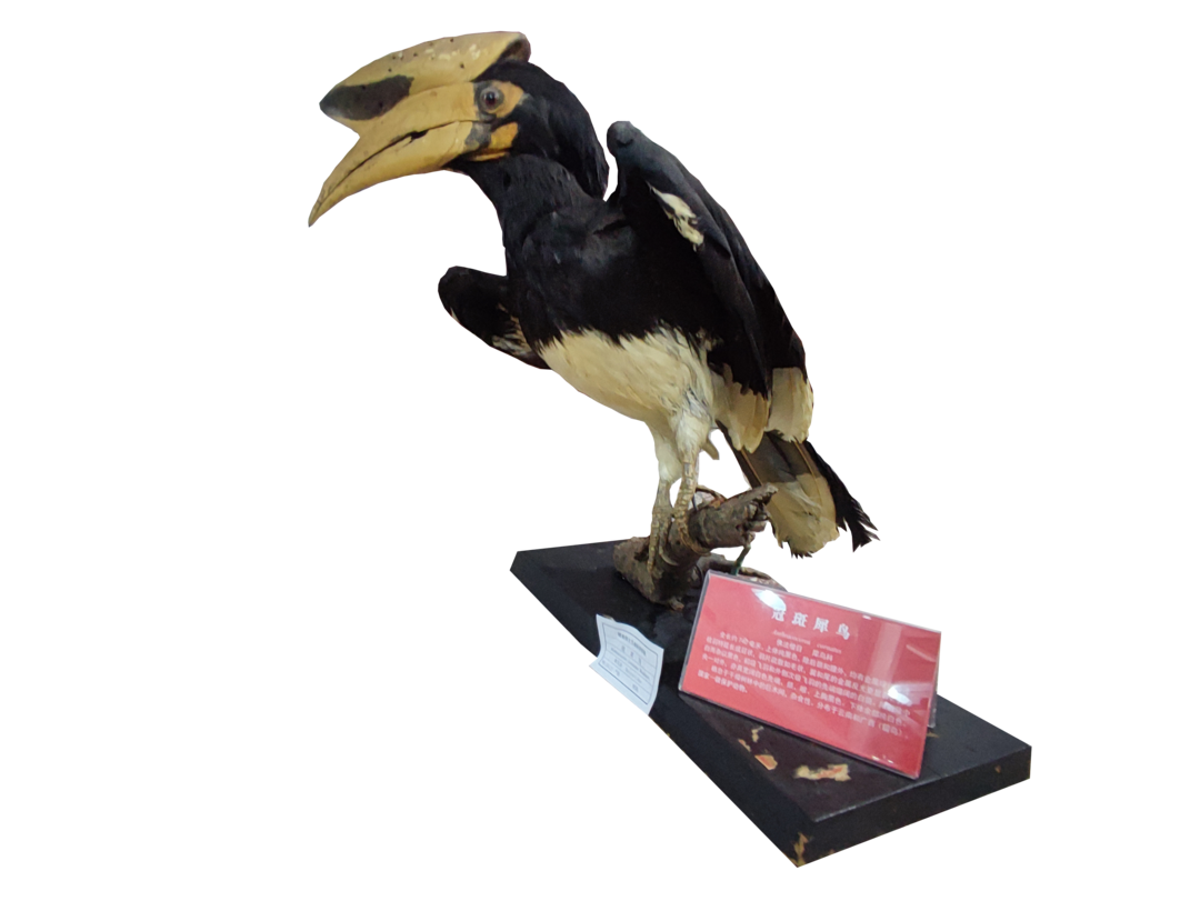 标本馆有冠斑犀鸟标本一件,标本来自长沙动物园,由梁启燊老师制作。