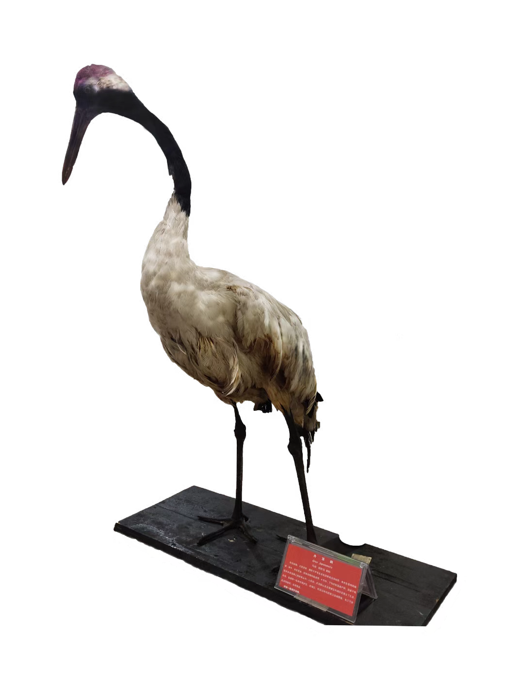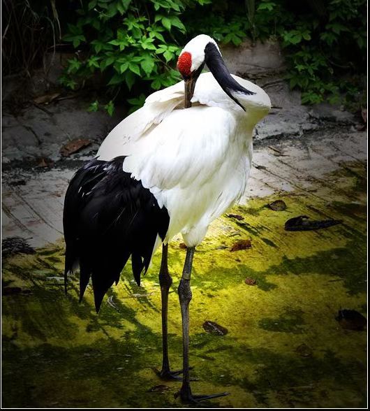 形态:丹顶鹤体长约160cm,翼展240cm,体重约7-10.5kg。全身几乎纯白色,头顶裸露无羽、呈朱红色,额和眼先端具黑羽,眼后方耳羽至枕白色,颊、喉和颈黑色。次级飞羽和三级飞羽黑色,三级飞羽长而弯曲,呈弓状,覆盖于尾上。嘴较长,呈淡绿灰色,尖端黄色。颈、腿也都很长,两翅中间长而弯曲的飞羽,为黑色,虹膜褐色,胫裸露部分和跗蹠及趾灰黑色,爪灰色。